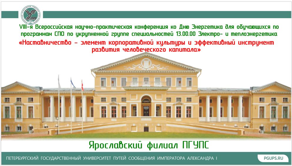 18 декабря 2025 г. в Ярославском филиале ПГУПС состоится традиционная VIII Всероссийская научно-практическая конференция ко Дню Энергетика для обучающихся по программам СПО по укрупненной группе специальностей 13.00.00 Электро- и теплоэнергетика «Наставничество — элемент корпоративной культуры и эффективный инструмент развития человеческого капитала»