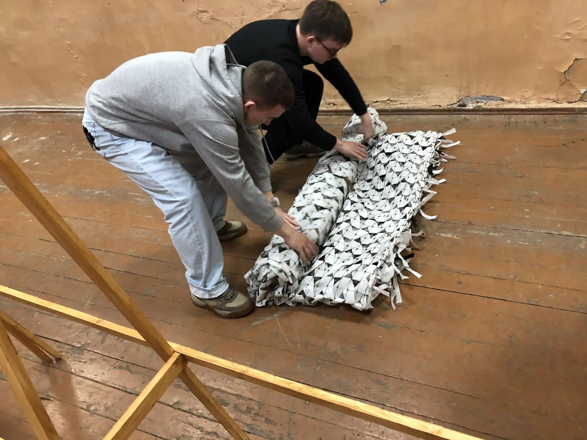 Посильную помощь внесли и наши студенты. На базе Ярославского высшего военного училища противовоздушной обороны им. Маршала Советского Союза Л.А. Говорова для студентов Ярославского филиала ПГУПС гр.41-П-9 специальности «Строительство железных дорог, путь и путевое хозяйство» и преподавателей филиала провели занятие по плетению маскировочных сетей.